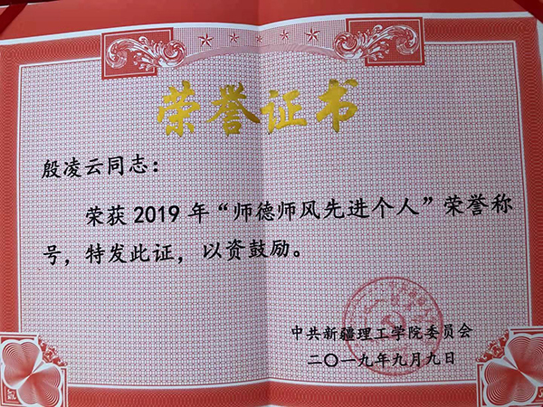 我校援疆教师殷凌云教授荣获新疆理工学院2019年“师德师风先进个人”荣誉称号。